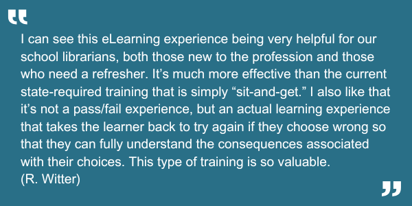 I wanted the experience to immerse the learner in various situations that arise while working in a school library. To do this, I set up the story of a newly hired middle school librarian in the fictional Galt’s Gulch School District. I used the actions identified on the action map to develop three situations regarding appropriate book selection for their school library. With the help of a mentor character, who provides on-demand insights into the required knowledge, the learner negotiates each situation, each of which has three possible real-world consequences that are played out to allow the learner to fully experience the effects of making mistakes in a risk-free environment. The storyboard contains the prompt text, character dialogue, visual notes, and programming notes to guide the final development of the product.